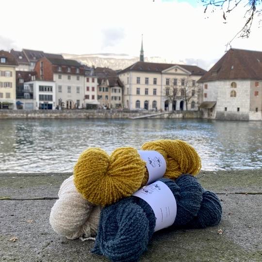Das wunderschöne Material einer Englischen Spinnerei wird in Wettingen liebevoll von Hand gefärbt. Durch das Färben können Farbrückstände im Wasser bleiben.