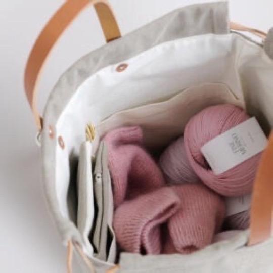 Die Tasche hat einen runden Boden und besitzt guten Stand, sowie viel Übersichtlichkeit und Ordnung im Inneren. Im grossen Fach finden mehrere Wollknäuel und ein mittelgrosses Handarbeitsprojekt Platz. Die gefütterte Tasche verfügt über zwei schmale Fächer für Nadelspiele, Schere und Stifte und zwei mittelgroße Fächer für Maschenmarkierer, Massband, Rundstricknadeln, ein Handy oder ein kleines Tablet.